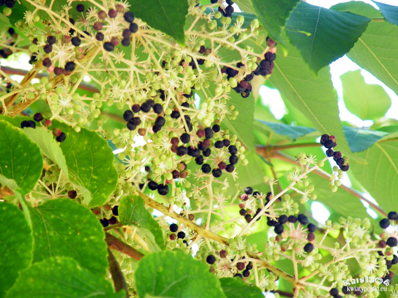 Owoce podobne do jagód, ciemne, 5 mm średnicy z 5 pestkami.