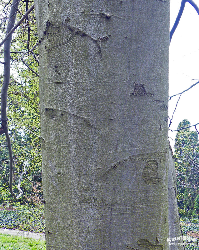 Kora stanowi niezawodny znak rozpoznawczy tego drzewa. Wyróżnia się ona przede wszystkim bardzo charakterystycznym, jasnym, ołowiowoszarym zabarwieniem oraz tym, że zawsze pozostaje gładka. Młode pędy obłe, brunatnopurpurowe i lekko błyszczące, stosunkowo gładkie (pokryte jedynie rozproszonymi przetchlinkami), nagie. Pąki osadzone na krótkich trzonkach, w kształcie wrzecionowate, długie (1.5-3cm) i wąskie (liściowe 2-3mm, kwiatowe 3-5mm), mocno zaostrzone, z licznymi nakrywającymi się spiralnie, szpiczastymi, brązowo cieniowanymi łuskami. Pąki boczne mocno odstające od pędu.