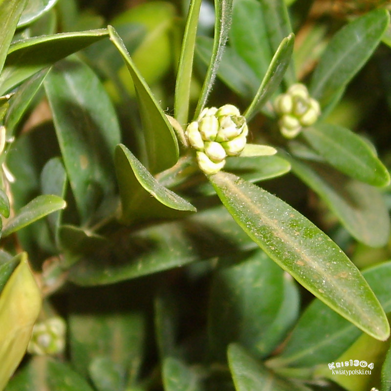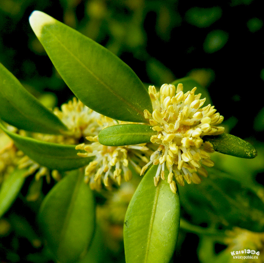 Skórzaste, błyszczące, eliptyczne, ciemnozielone liście ustawione naprzeciwlegle na pędach, bardzo gęsto. Mają charakterystyczny zapach.