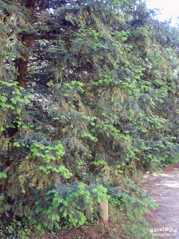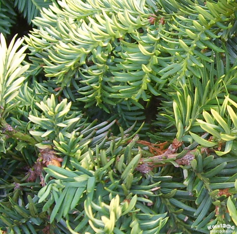 Zimozielone, spłaszczone, o długości 2 - 3 cm, lekko wygięte, niekłujące, miękkie, osadzone na krótkim, cienkim ogonku. Górna strona - ciemnozielona, błyszcząca, spodnia - znacznie jaśniejsza, matowa. Brak białych pasków oraz przewodów żywicznych. Bez zapachu. Igły na pędzie rozłożone dwustronnie grzebieniasto lub skrętolegle. Pozostają na pędzie przez 6 - 8 lat.