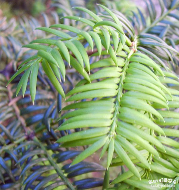 Kwiaty żeńskie są bardzo małe, zielone, podobne do pąków liściowych, pojawiają się na dolnej stronie pędów. W pełni rozwinięte posiadają różowy wierzchołek z kanalikiem, z którego wydobywa się kropla mikropylarna. Kwiaty męskie kuliste, żółtozielone, liczne, łuskowate, ułożone w kątach igieł. Pylniki tarczowate, silnie pofałdowane.