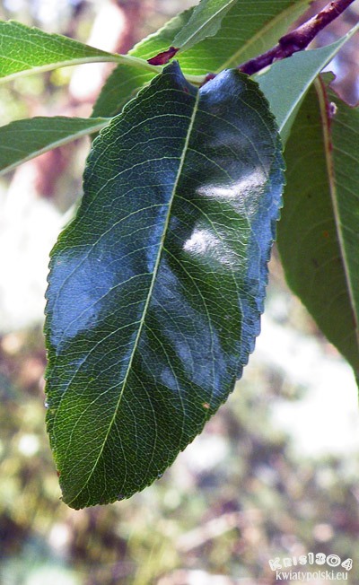 Ulistnienie skrętoległe. Liście owalne do szeroko lancetowatych, na końcu stopniowo lub nagle zaostrzone, u nasady klinowato zbiegające. Brzeg karbowano-piłkowany z ciemnoczerwonym gruczołkiem u nasady każdego ząbka. Blaszka liściowa nieco skórzasta, z wierzchu ciemnozielona i błyszcząca, od spodu jaśniejsza. Występuje co najmniej 15 par nerwów bocznych. Liście odmiany typowej osiągają od 5 do 15 cm długości i od 2,5 do 4 cm szerokości. Jesienią liście przebarwiają się na intensywnie żółty kolor. Ogonek liściowy cienki, osiąga od 12 do 20 mm długości.
