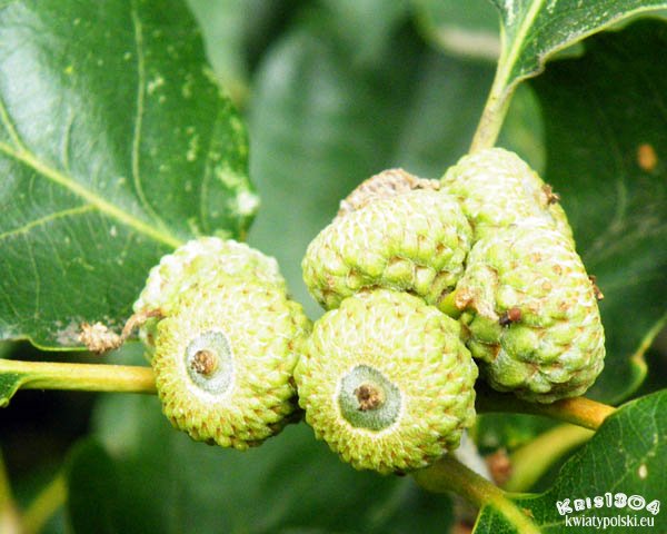 Tzw. żołędzie - groniasto skupione po 1-6 sztuk na wierzchołkach pędów podługowato-owalne orzechy, osadzone w półokrągłych miseczkach, początkowo zielone, po dojrzeniu jednolicie ciemnobrunatne, zarówno niedojrzałe jak i dojrzałe bez podłużnych ciemnych pasków, umieszczone na bardzo krótkich (zawsze krótszych niż ogonek liściowy) szypułkach lub wręcz siedzące.