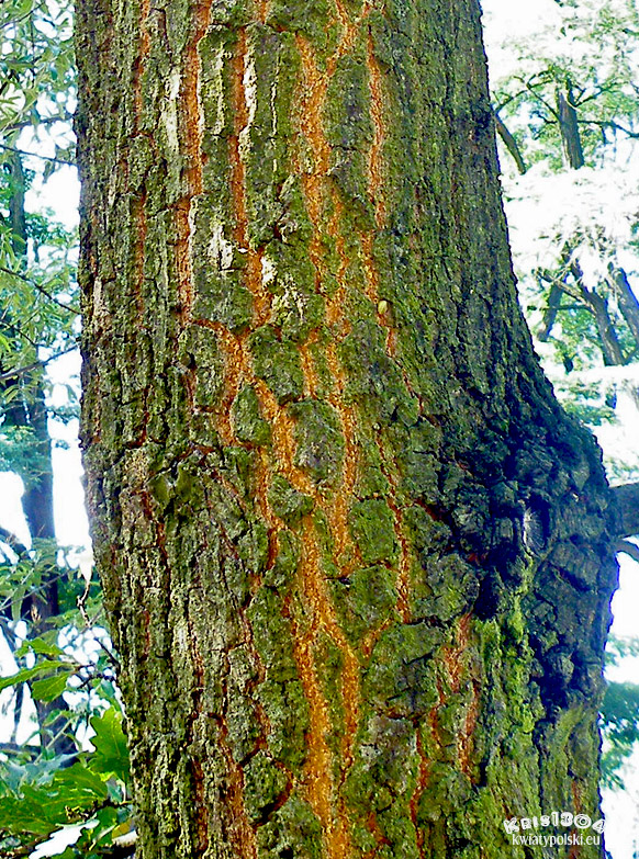 Kora gruba, szorstka, koloru popielatoszarego, wyraźnie bruzdowana, często odpadająca małymi płytkami.