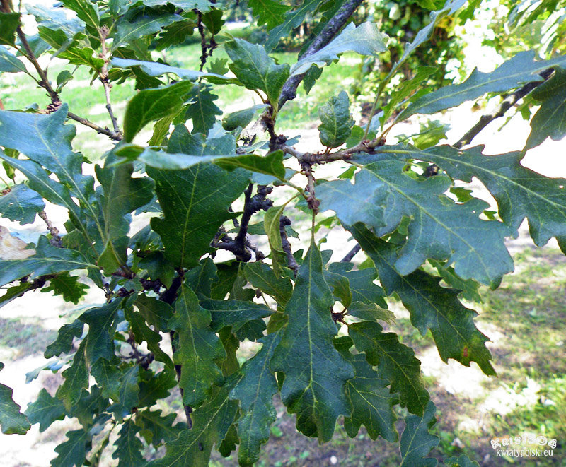 Długości 8-11 cm, szerokości około 5 cm. Podłużne, z wrębami, mają ogonki długości 2,5 cm, opadają na zimę. Na obu końcach równomiernie klinowato zwężone, po obu stronach z siedmioma - dziewięcioma niejednakowej wielkości klapami, rozdzielonymi przez ostro zbiegające zatoki. Blaszki liścia zwykle tylko do połowy wcięte. Klapy okrągławe lub delikatnie zaostrzone, z małym ząbkiem na szczycie. Często jednak całkiem tępe. Wierzchnia strona liścia jest ciemnozielona i błyszcząca (młode liście są szorstkie i lekko owłosione). Spodnia jaśniejsza i pokryta miękkim meszkiem, który utrzymuje się przez cały okres wegetacyjny.