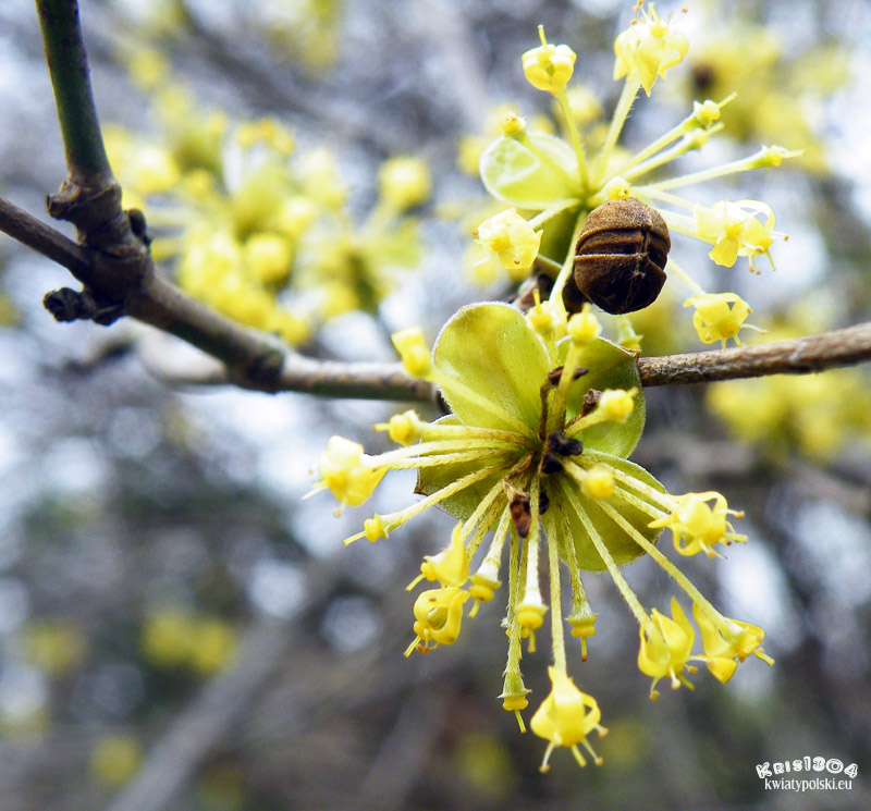 Obupłciowe (obok nich także liczne męskie), owadopylne, zebrane po 10-25 sztuk w gęste, baldachowate kwiatostany. U podstawy każdego baldachu znajdują się 4 łuskowate listki okrywy (są to nie powiększające się w trakcie kwitnienia zewnętrzne łuski pąków kwiatowych). Pojedyncze kwiaty drobne, posiadają podwójny, 4-krotny okwiat, pachną niezbyt przyjemnie. Płatki korony jaskrawożółte, lancetowate i zaostrzone, długości 2-3mm. Słupek kubkowaty (zalążnia dolna), owłosiony, 4 pręciki osadzone na dużym, żółtym dysku miodnikowym.