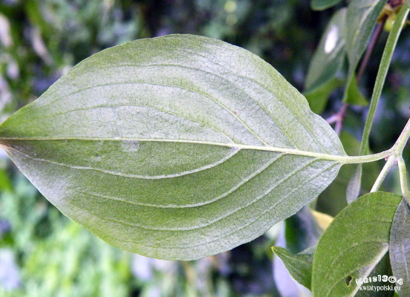 Blaszkowate, pojedyncze. Blaszka eliptyczno-jajowata, z przedłużonym wierzchołkiem, długości 5-10 cm, całobrzega, zielona (od spodu jaśniejsza), z wierzchu lekko błyszcząca, w kątach nerwów posiada kępki białych włosków. Charakterystyczną cechą jest łukowata nerwacja z 3-5 parami jasnych, mocno wystających od spodu nerwów. Ustawienie naprzeciwległe na krótkich, rynienkowatych ogonkach, często czerwonawych.
