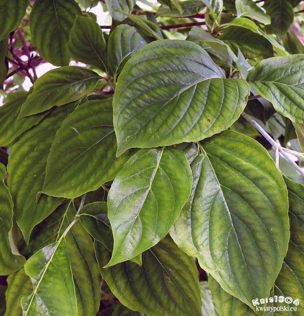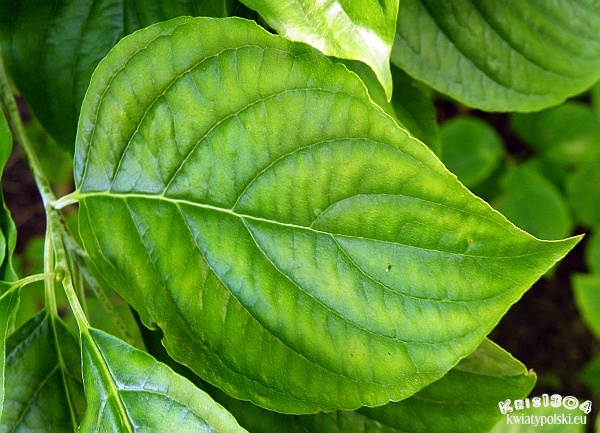 Jajowato-eliptyczne, do 15 cm długości, z 5-7 parami nerwów, gładkie, z wierzchu ciemnozielone, spodem białawe. Po obu stronach pokryte przylegającymi włoskami. Jesienią przebarwiają się na kolor czerwono-karminowy do fioletowego.