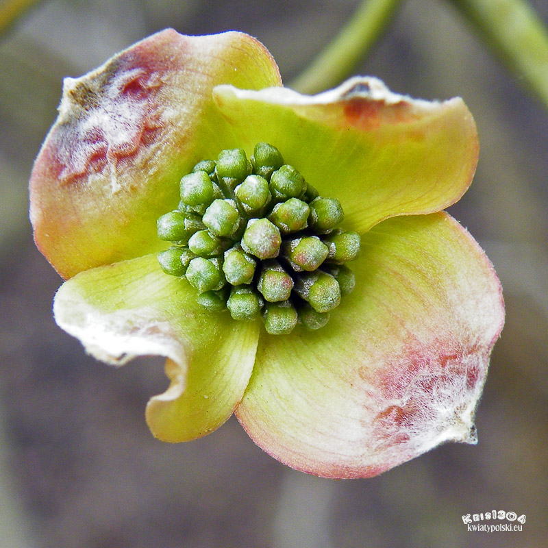 Rozwijają się przed liśćmi. Są obupłciowe, drobne, zielonkawe lub żółtawe, zebrane w drobne główkowate kwiatostany o średnicy ok. 12 mm. Cztery okazałe podsadki pod kwiatostanem to rozrośnięte najbardziej zewnętrzne pary łusek "cebulkowatych" pączków kwiatostanowych, odwrotnie jajowate i na szczycie wykrojone. Pojedyncza podsadka ma około 3 cm długości (do 5 cm) i 2,5 cm szerokości. Barwa biała do czerwonej w zależności od odmiany.