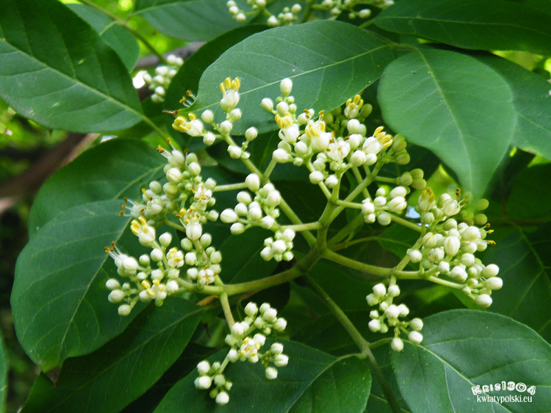 Kwitnie bardzo obficie. Kwiaty drobne, pachnące, pięciopłatkowe, białawe, średnicy 3-4 mm, zebrane w szerokostożkowate (10-16 cm szerokości) wiechy. Baldachogrona dojrzałych owoców, wyglądają jak duże wiechy czerwonych kwiatów, które na tle jeszcze w tym czasie soczystozielonych liści wygłądają bardzo dekoracyjnie.