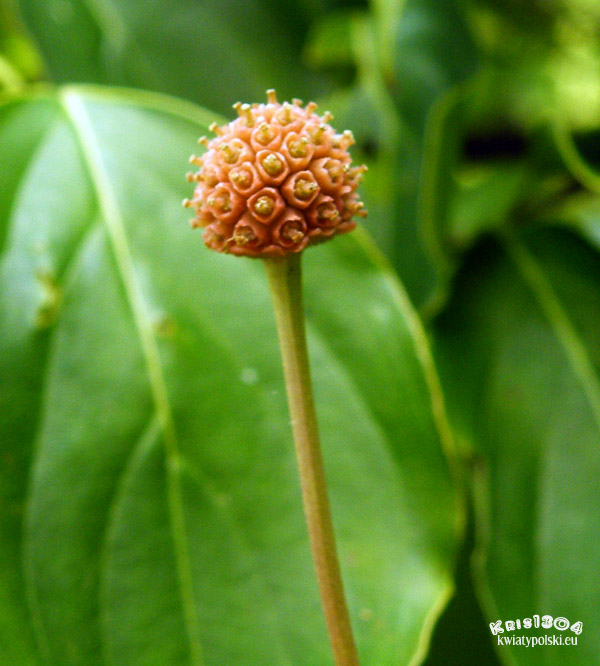 Charakterystyczne są kuliste kwiatostany o średnicy ok. 3 cm, znajdujące się na wierzchołkach pędów. Składają się z drobnych, kremowobiałych, pachnących, obupłciowych, zrosłopłatkowych kwiatów.