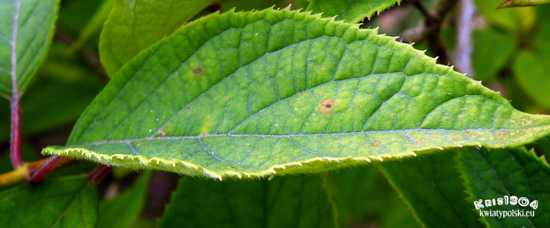 Niebiesko-zielone, kolczasto ząbkowane na brzegu, czasami z jaśniejszymi przebarwieniami.