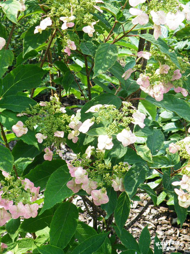 Zebrane w białe, koronkowe kwiatostany. Płatki 4. Kwiatostany są szerokie, płaskie i luźne, o miodowym zapachu. Białe, płonne kwiaty pojawiają się w połowie lata i z upływem czasu przebarwiają się na delikatne odcienie różu. Mają około 20 cm średnicy.