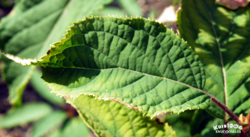 Liście duże, owalne, o krwistoczerwonych ogonkach i czerwonawo podbarwione na brzegach, jesienią zmieniają barwę na żółtpomarańczową.