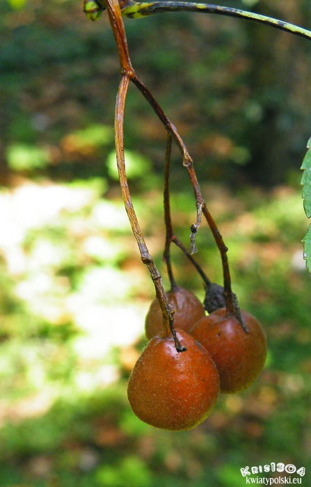 Owoce elipsoidalne, podłużniejajowate, brązowe i jasno nakrapiane, długości ok. 1,5 cm, na długich szypułkach, zawierające po dwie pestki.