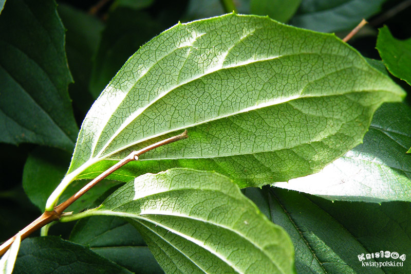Eliptyczne, zaostrzone, drobno ząbkowane, nagie (tylko na spodniej stronie występują kępki włosków na nerwach). Liście mają długość 4-8 cm - 6-11 par ząbków.