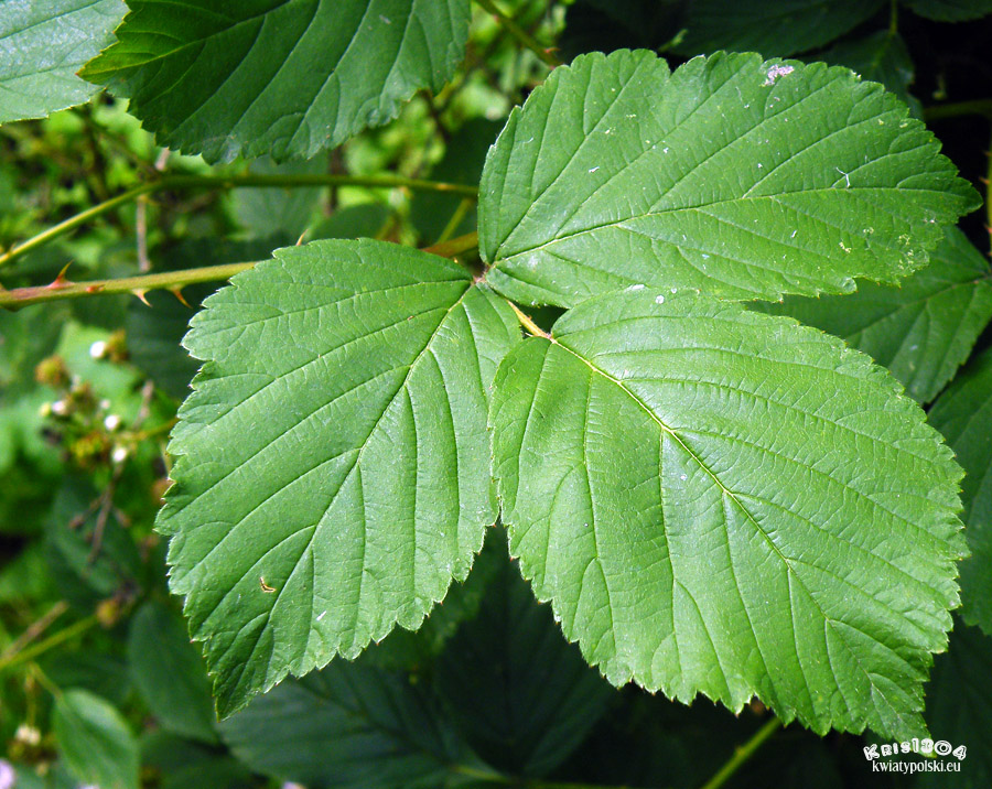 Liście pędów płonnych dłoniasto złożone, 5-listkowe, wierzchem błyszczące, nagie, ciemnozielone, strona dolna owłosiona, zielona. Ogonki liściowe owłosione, na dolnej stronie o licznych, hakowatych kolcach, przylistki nitkowate.