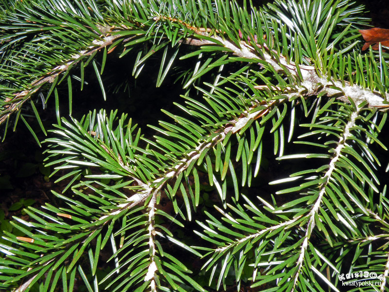 Ułożone promieniście wokół pędu sztywne igły o długości 2-3 cm. Ich górna powierzchnia jest błyszcząca, zielona, na dolnej są dwa białe, równoległe paski. Brzeg skórzasty, matowy.