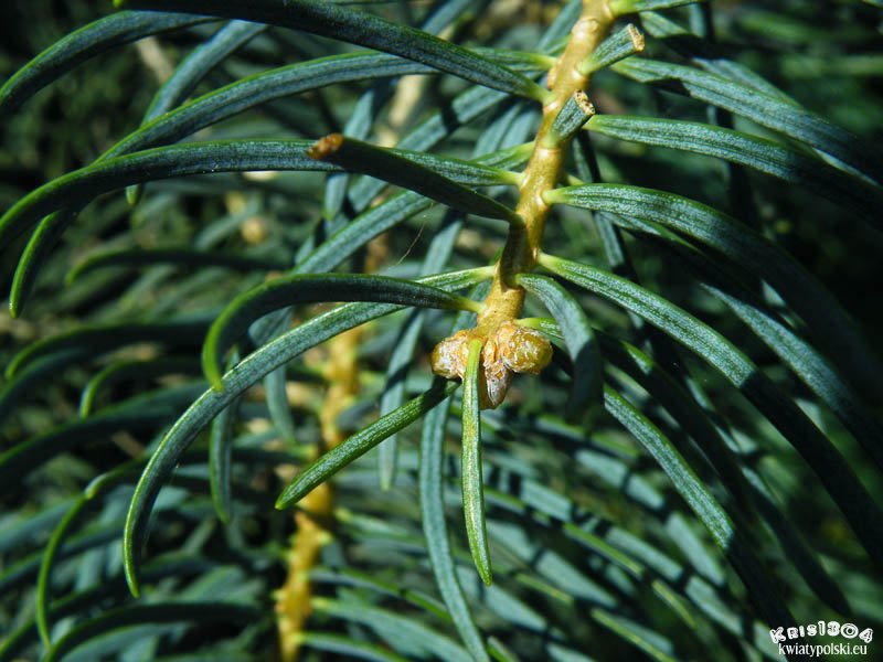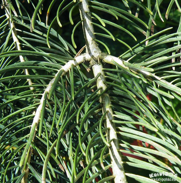 Bardzo długie igły (4-7 cm), miękkie, szablasto wzniesione, z zaokrąglonymi wierzchołkami, z obu stron szarozielone lub niebieskawe.