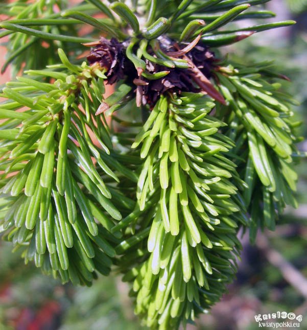 Szpilki o długości 2-3 cm są z przodu lekko wycięte, równowąskie, wyraźnie bruzdkowane, z wierzchu ciemnozielone i błyszczące, pod spodem - z dwoma białymi paskami szparek. Osadzone dwurzędowo na gałązkach bardzo gęsto, skierowane nieco ku przodowi. Roztarte - wydzielają owocowy zapach.