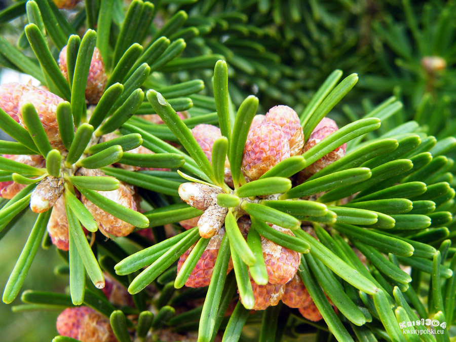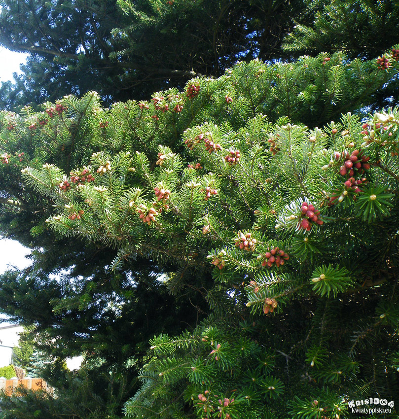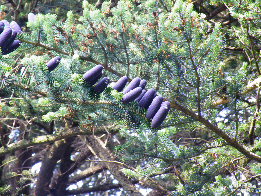 Szyszki do 7 cm długości, z fioletowym nalotem. Na gałęziach pojawiają się już po kilku latach od posadzenia drzewa. Po dojrzeniu rozsypują się.