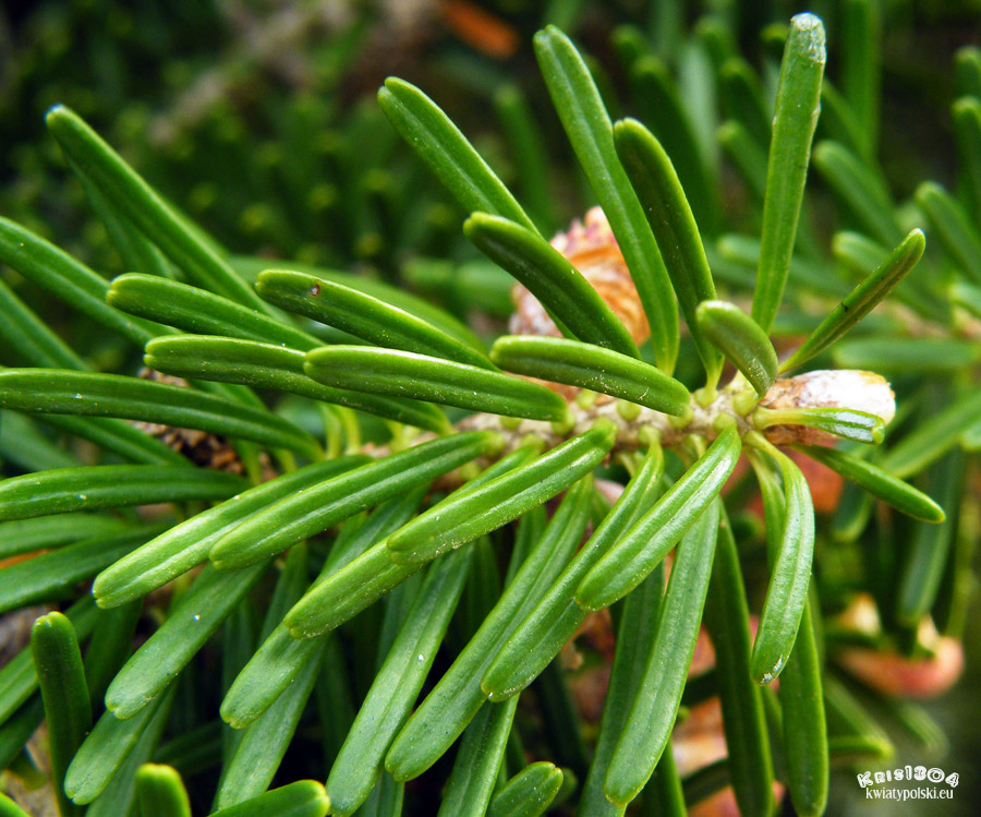 Płaskie igły o długości 1-2 cm, szerokości 2-2,5 mm oraz grubości 0,5 mm. Na pędach ułożone promieniście otaczają gałązkę, od góry ciemnozielone, od spodu białawe.