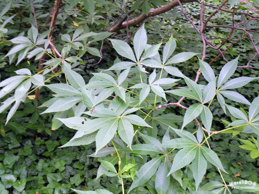 Dłoniasto złożone z 5 (rzadziej 7) karbowanych listków osadzonych na ogonkach.i. Mają długość 10-18 cm i spodnią część szaro omszoną. Brzegi są drobno karbowanopiłkowane. Wiosną liście są brązowe, jesienią przebarwiają się na kolor jaskrawożółty.