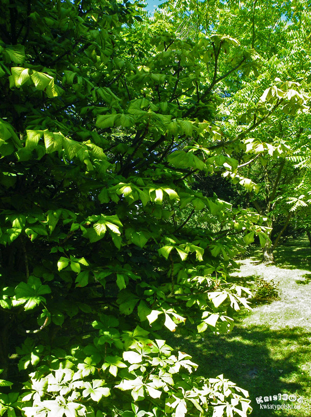 Drzewo pokrojem zbliżone do kasztanowca białego, wysokości do 30 m.