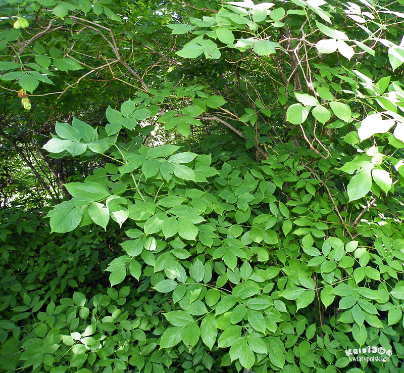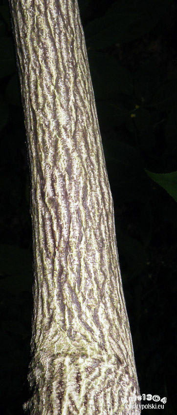 Kora gładka z białymi pionowymi prążkami. Pączki lekko spłaszczone, odstające nieco od gałązek. Roczne pędy z resztkami owłosienia, oliwkowozielone, czasami z brunatnym odcieniem. Na starszych pędach widoczne liczne przetchlinki. Blizna liściowa półkolista, wyniosła, płaska, brązowawa. Ślady po wiązkach przewodzących ułożone półkoliście bądź wokół całej blizny liściowej.