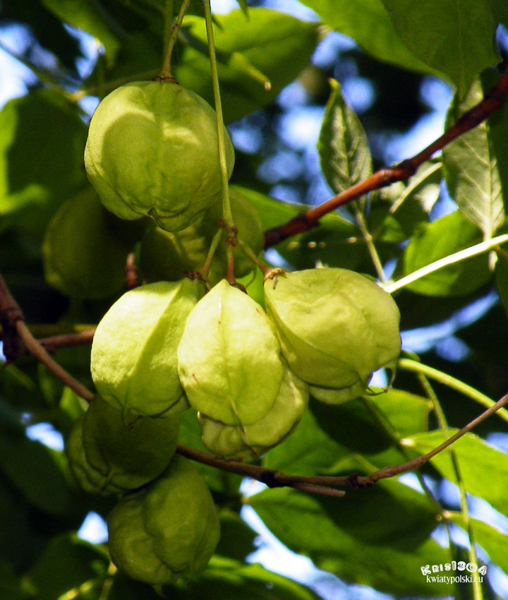 Dekoracyjne, rozdęte 2-3 komorowe torebki długości około 3 cm. Kształt torebki jest najczęściej kulisty, niekiedy sercowaty. Ściany torebki pergaminowate, początkowo jasnozielone, potem przebarwiają się na kolor brunatny, słomkowożółty lub pomarańczowy. W torebce znajduje się kilka twardych, lśniących nasion o kolorze jasnobrązowym.