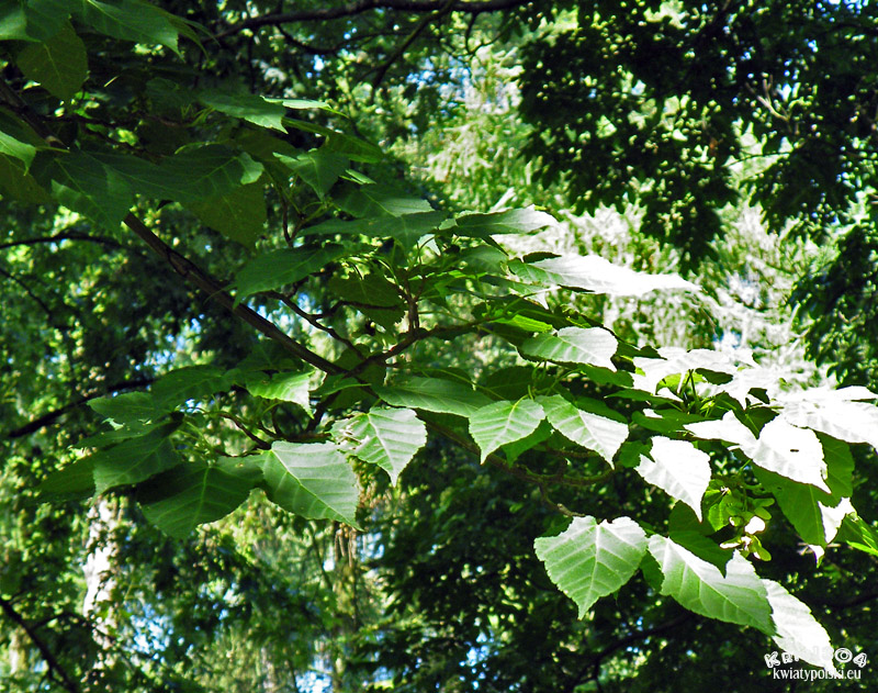 Jajowate, o długości około 15 cm i szerokości 10 cm. Mają kolor ciemnozielony, błyszczący. Jesienią liście przebarwiają się na jaskrawy kolor żółto-pomarańczowy.