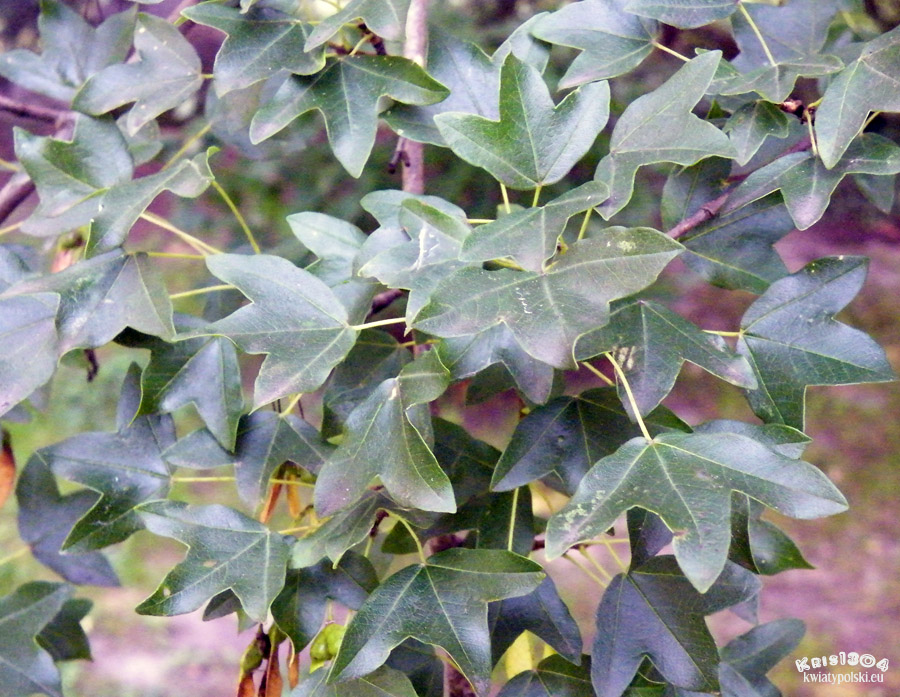 Ulistnienie naprzeciwległe. Liście są drobne, trójklapowe, błyszczące. Boczne klapy są lekko rozchylone. Są całobrzegie, nie posiadają ząbków. Szerokie na 3-8 cm. Z wierzchu są ciemnozielone, natomiast od spodu sinozielone. W dotyku są skórzaste. Osadzone na długim ogonku.