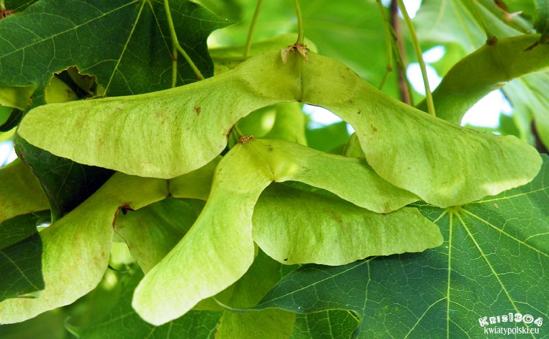Podwójne skrzydlaki z dużymi, płaskimi (różnica w stos. do jawora) orzeszkami i szerokimi skrzydełkami długości 4-5 cm, ustawionymi pod kątem mocno rozwartym (co najmniej 120°), początkowo jasnozielonymi, po dojrzeniu brązowymi.
