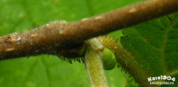 Blaszkowate, pojedyncze. Blaszka okrągława do szeroko odwrotnie jajowatej, u nasady lekko sercowata, na końcu z krótkim, acz wyraźnie zaznaczonym wierzchołkiem, dość duża - o średnicy 8-12 cm, na brzegu głęboko i ostro podwójnie piłkowana (czasami częściowo wrębna), matowo zielona, miękka i delikatna w dotyku, z góry lekko pomarszczona, początkowo obustronnie miękko owłosiona, z czasem na wierzchu łysiejąca. Ustawienie skrętoległe na krótkich, ok. 1 cm, gruczołkowato owłosionych ogonkach.