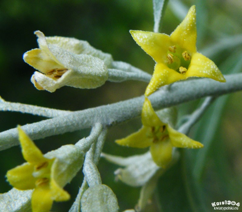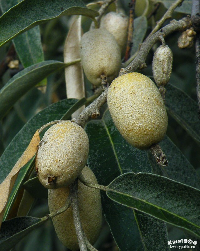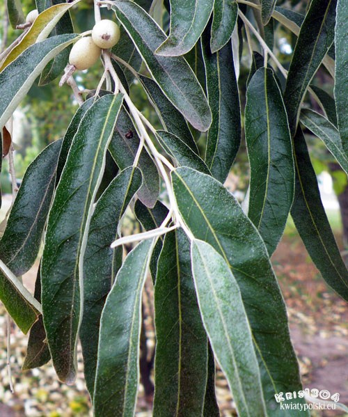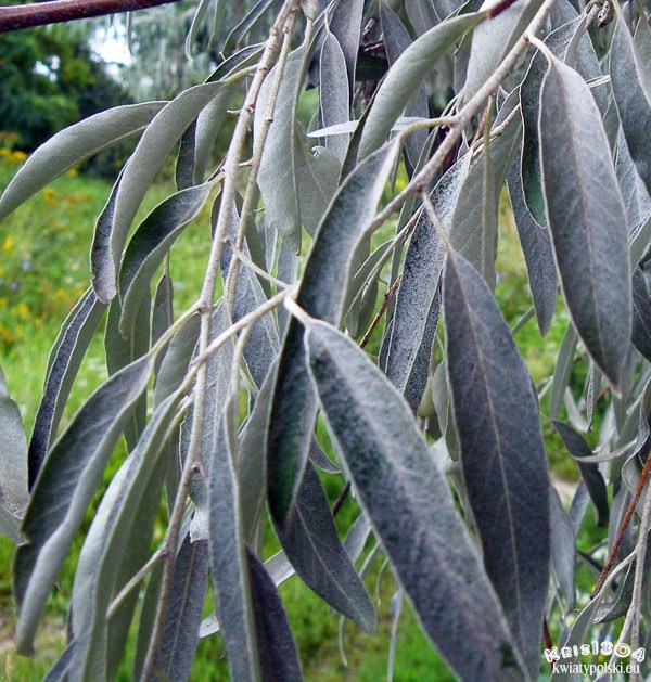 Liście lancetowate do 5 cm długości, z obu stron pokryte srebrzystymi włoskami. Liście opadają późno i nie tracą zabarwienia.