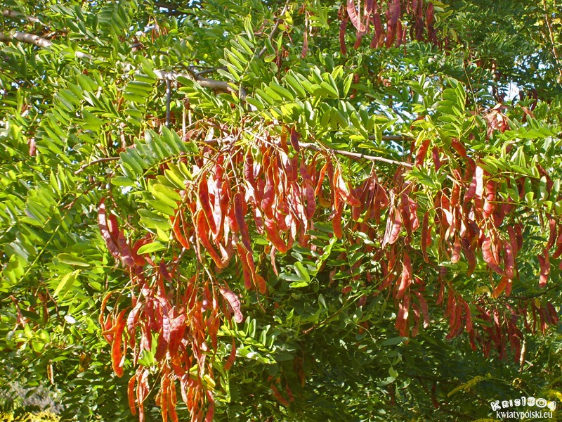 Nagie, gładkie i spłaszczone strąki, od września do wiosny pozostające na drzewie. Ich długość dochodzi do 12 cm. Wewnątrz są białej barwy i zawierają 6-8 brązowawych lub czarnych nasion o nerkowatym kształcie.