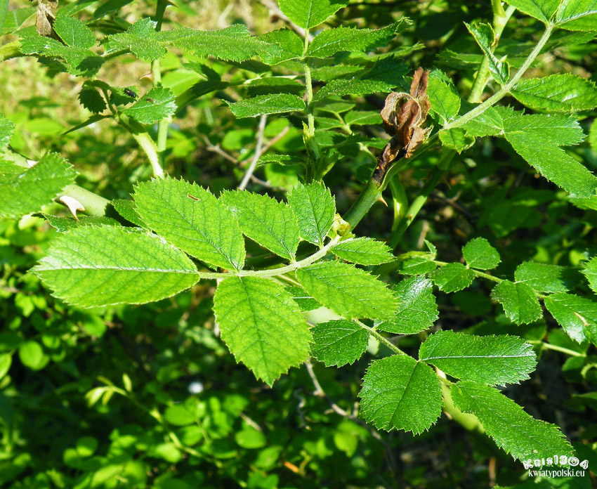 Złożone z 5-7 jajowato-eliptycznych listków. Listki podwójnie ząbkowane, a ząbki ogruczolone. Listki skąpo owłosione lub nagie, podłużnie eliptyczne.