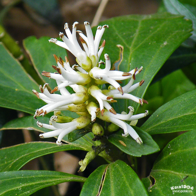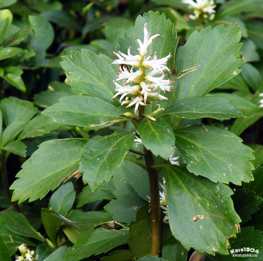 Z rozłogów wyrastają okółki ciemnozielonych, skórzastych, podługowatych, grubo ząbkowanych liści.