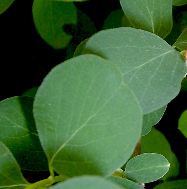 Niebieskawozielone, okrągławoeliptyczne, ok. 4 cm długości, pojedyncze lub klapowane.