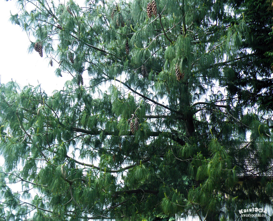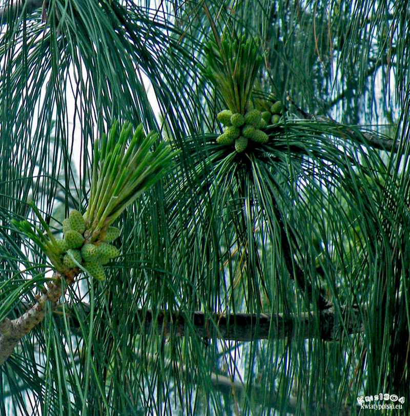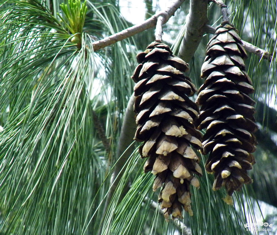 Szyszki żeńskie cylindryczne, początkowo osadzone pionowo i zieloniebieskie, później zwisające, jasnobrązowe, nieco zakrzywione, osiągają długość ok. 30 cm. Osadzone na długich szypułkach (do 5 cm), w grupach po 1-6. Wierzch szyszki jest bardzo żywiczny, cienkie łuski mają duży, bruzdowaty wyrostek.