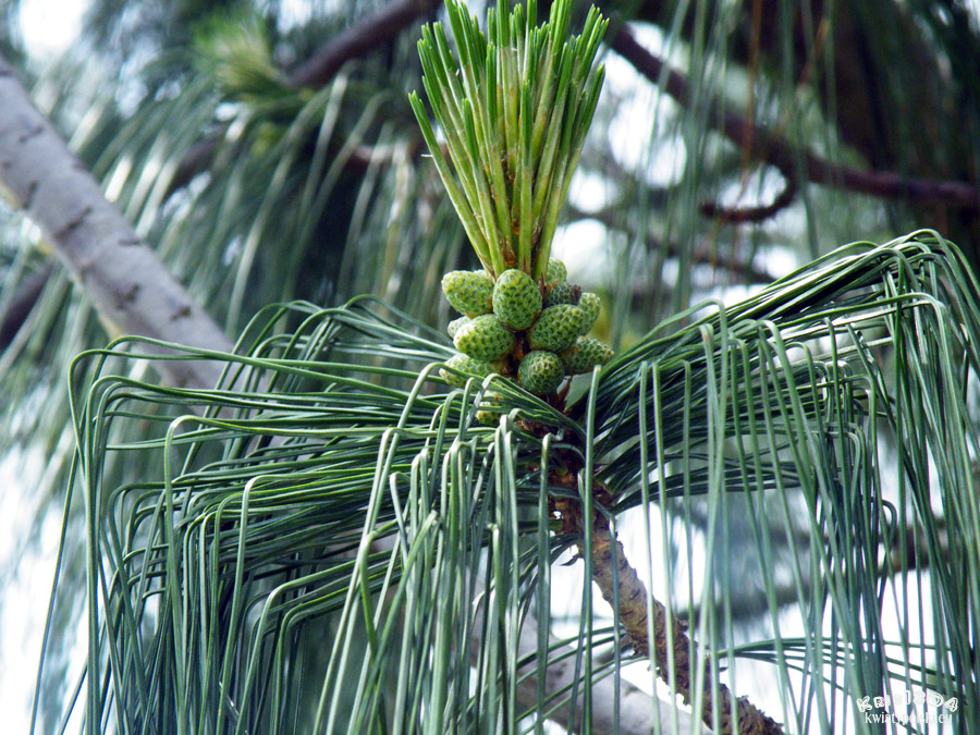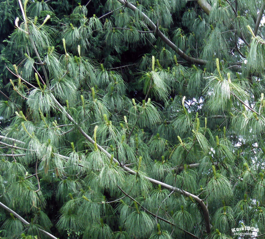 Miękkie i cienkie igły, o srebrzystoszarym zabarwieniu, zwisające, o długości ok. 20 cm, zabrane w pęczki po 5 sztuk. Po wewnętrznej stronie podłużne, biało-niebieskie paski.
