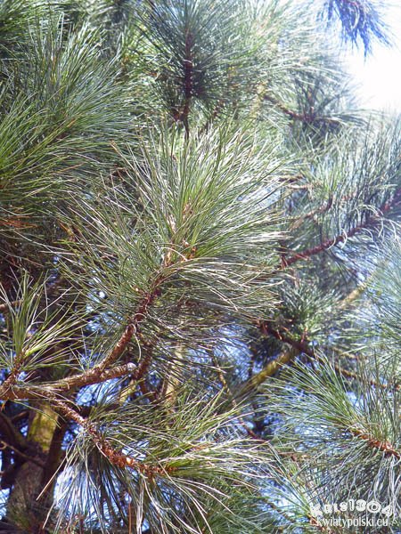 Sztywne szpilki zebrane w pęczki po 5 na krótkopędach, ciemnozielone lub sinozielone, z delikatnie ząbkowanym brzegiem, gęsto osadzone na gałązkach. Długość 6-9 cm.