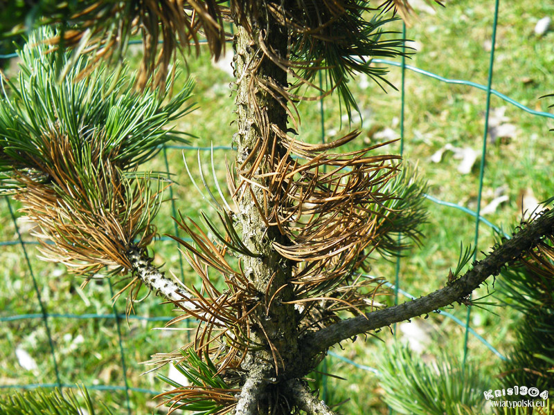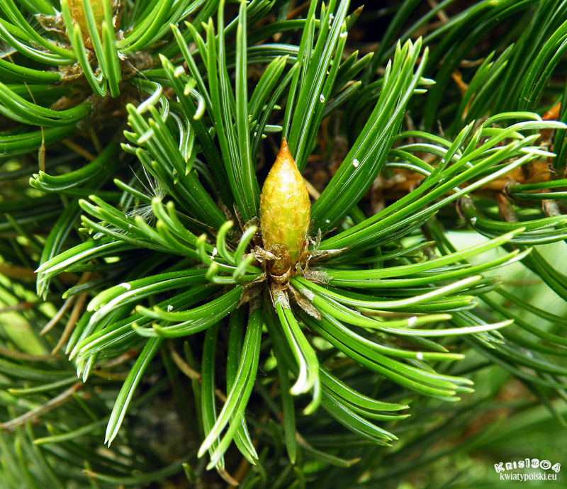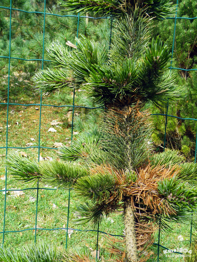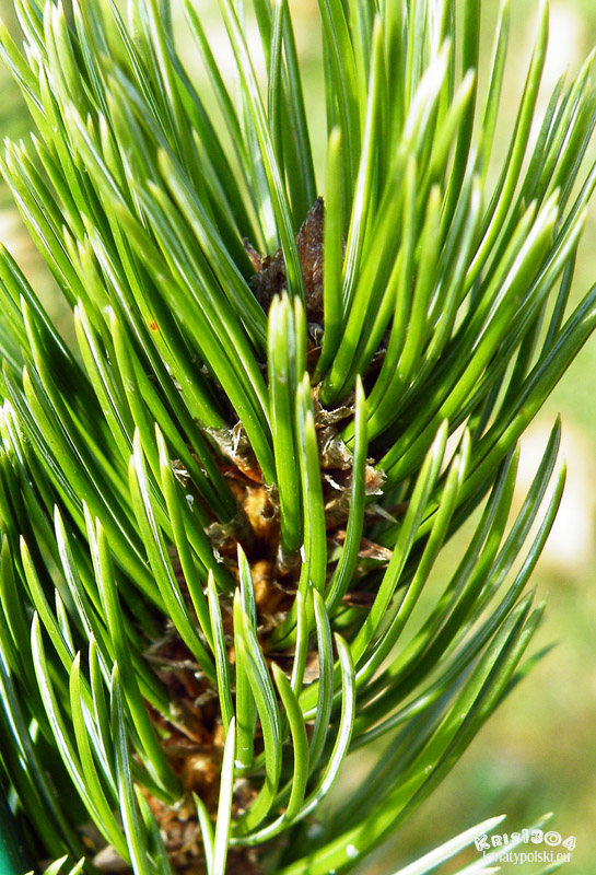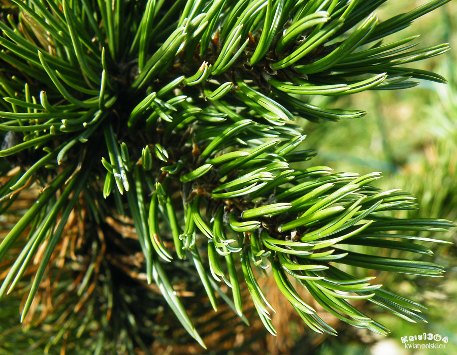 Igły zebrane w pęczki po 5, sztywne i mocne, długości 2-4 cm, grubości 0,8-1 mm, ciemnozielone lub sinozielone, gęsto porastające pęd. Igły niebiesko-zielone, pokryte charakterystycznymi białymi kroplami żywicy.