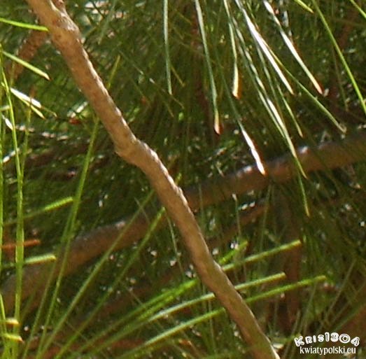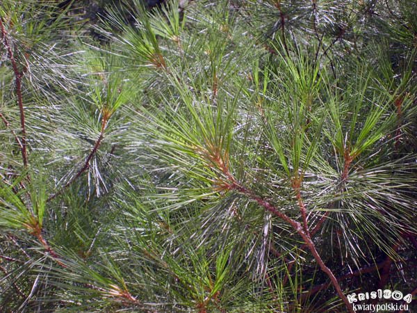 Igły zebrane po 5 na krótkopędzie, niebieskozielone, długości 6-10 cm, szerokości 0,7-1 mm, giętkie i cienkie, z opadającą pochewką liściową.