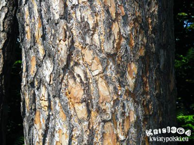 Kora u podstawy pnia starych drzew jest szarobrązowa i gruba, głęboko bruzdowana, w górnej części ma kolor rudawopomarańczowy i łuszczy się cienkimi płatami. Młode pędy nagie, początkowo jasnozielonkawe, gładkie i lekko połyskujące, wyprostowane pionowo w górę, potem zielonoszare do szarobrunatnych, odchylające się na boki. Pąki podługowate lub jajowate, delikatnie zaostrzone, długości do 1cm, z licznymi pomarańczowobrązowymi, cienkimi i czasami nieco odstającymi łuskami, żywicujące.