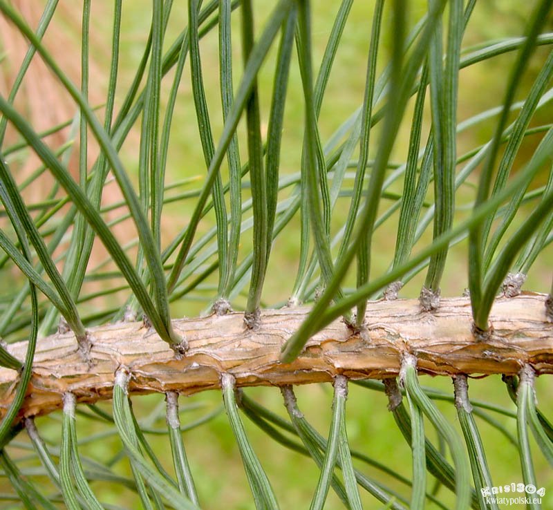Igły szarozielone do niebieskozielonych, osadzone parami na krótkopędach, długości 3-8 cm, sztywne, skręcone dookoła swojej osi. Pary igieł osadzone są promieniście i prostopadle do osi.