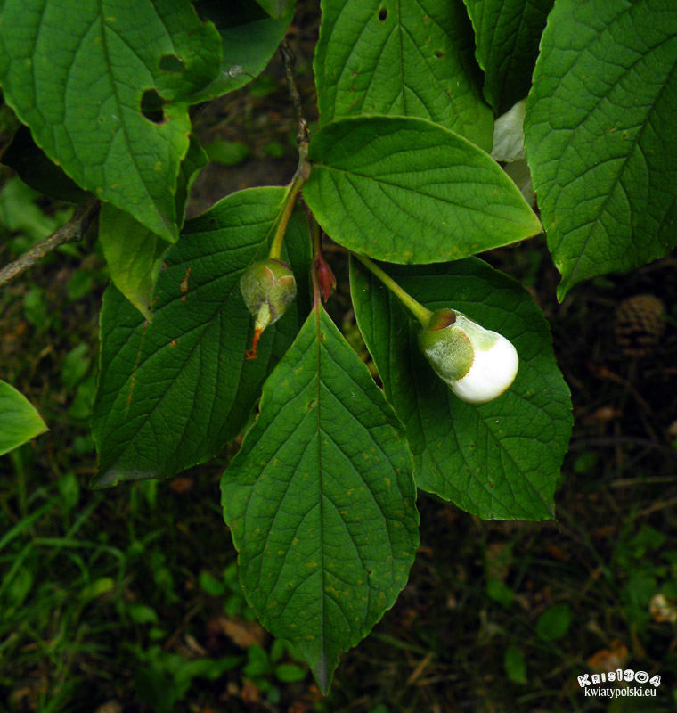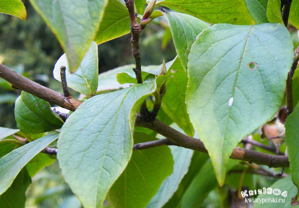 Sezonowe, eliptyczne do odwrotnie jajowatoeliptycznych, barwy zielonej. Na gałęziach ustawione skrętolegle. Jesienią przebarwiające się na wspaniałe kolory (czerwony, purpurowy i amarantowy).