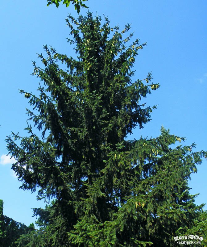 Korona smukła, stożkowata. Dolne konary z wiekiem zwieszają się, górne pozostają w większości poziomo. Pień osiąga wysokość 40-50 m, średnica pnia do 1,5 m. Pokrój świerka pospolitego przez całe życie pozostaje regularnie stożkowaty, a jego długi wierzchołek zawsze jest wyprostowany.