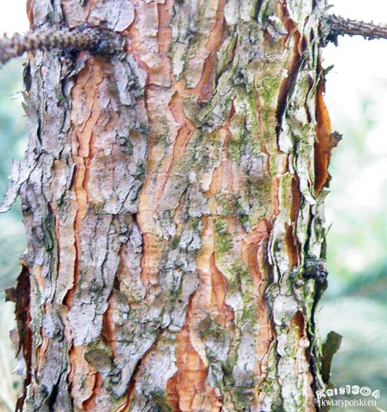 Od różowawobrązowej poprzez sarobrązową do brunatnoszarej, stosunkowo cienka, chropowata i płytko, łuskowato spękana na małe, odpadające poletka, w miejscach uszkodzeń często pokryta białymi naciekami żywicy. Młode pędy bruzdowane, żółtawe lub żółtobrązowe, nagie lub nieznacznie owłosione. Przyrosty roczne na końcach pędów gęsto pokryte soczyście jasnozielonymi, miękkimi szpilkami. W sprzyjających warunkach boczne przyrosty mogą osiągać do 30(50)cm długości, a szczytowy - nawet do 80cm. Pąki jajowate, lekko zaostrzone, jasno- do ciemnobrązowych, z cienkimi, przeważnie zaostrzonymi łuskami, boczne podobnej wielkości co wierzchołkowe, odstające od pędu.