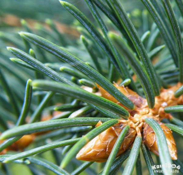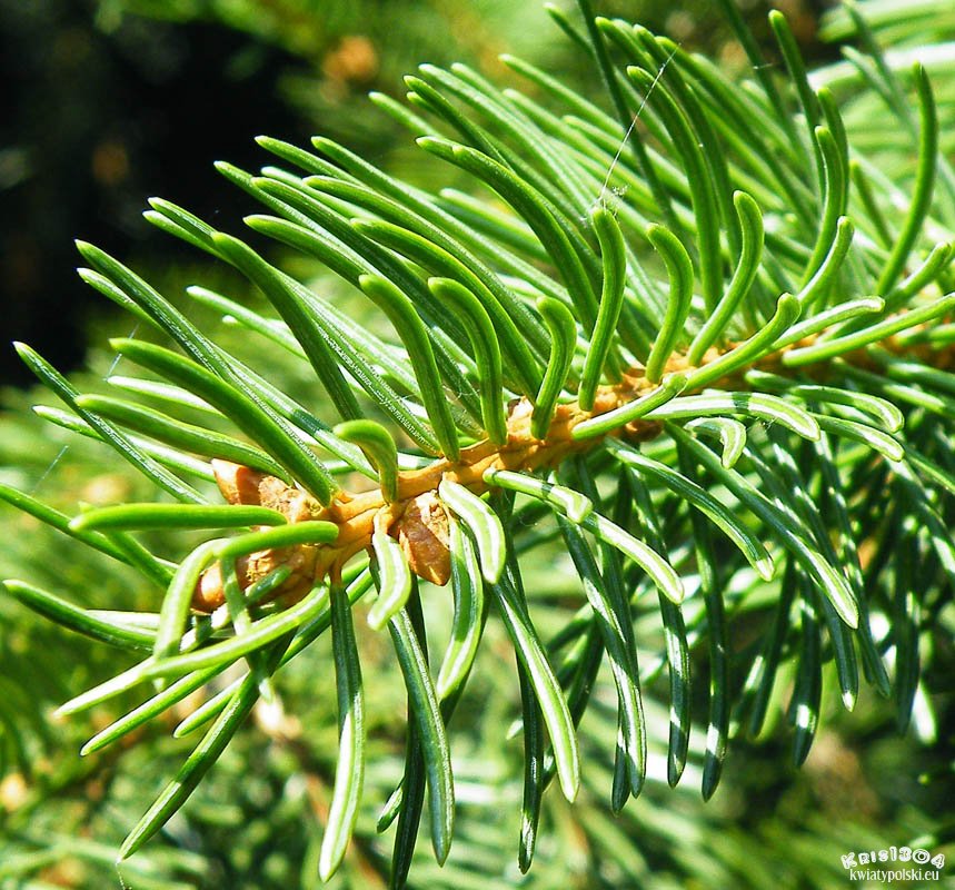Szpilkowate, długości 1.5-2.5cm, dość sztywne i szpiczasto zakończone przez co bardzo kłujące, czterokanciaste w przekroju, ciemnozielone, od spodu z dwoma delikatnymi, biało nakrapianymi paskami. Igły wyrastają pojedynczo. Są osadzone na małych, brązowych trzoneczkach, a po opadnięciu zostawiają na gałązce ostrą bliznę.